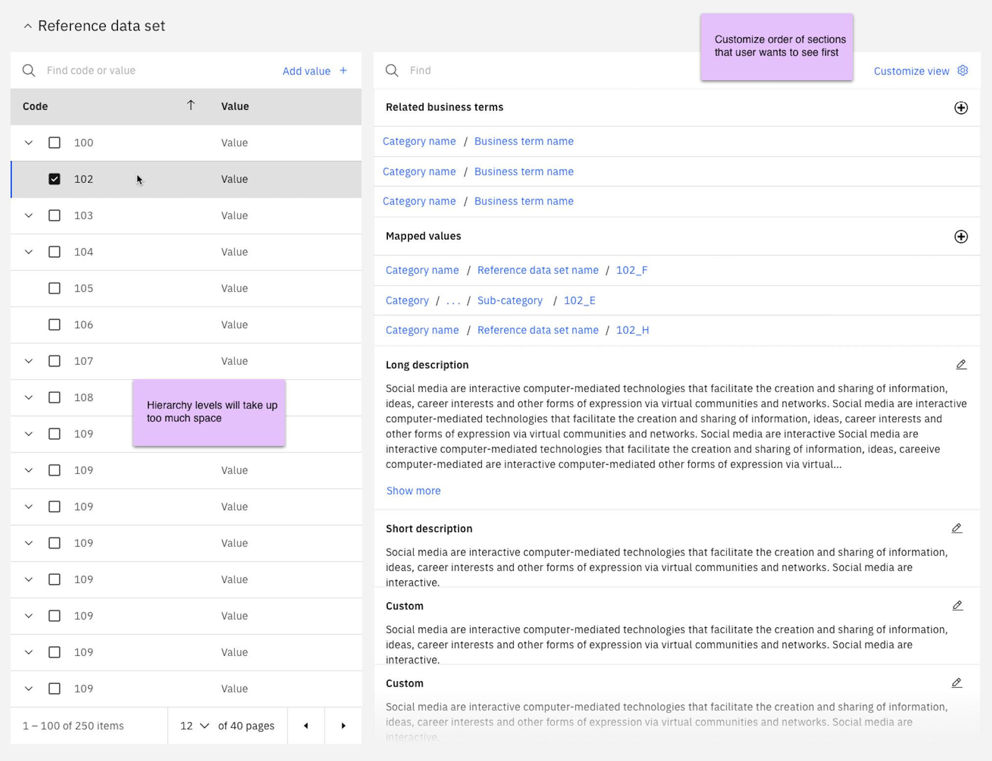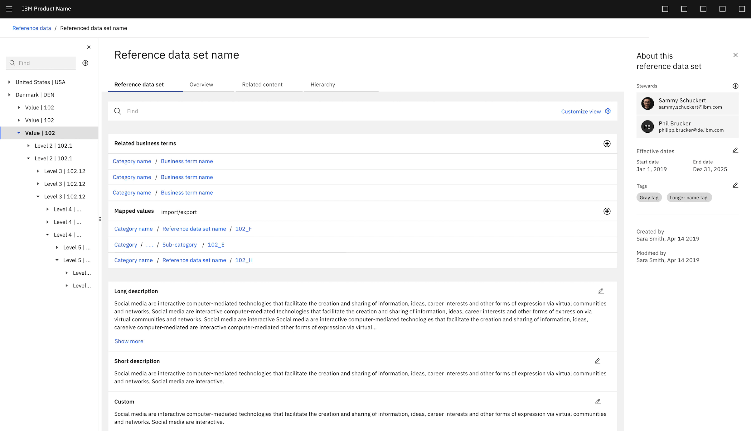 Data stewards managing large reference data sets (think medical terminology catalogs with 70+ levels of parent-child relationships, or financial code libraries used across global departments) had no way to navigate those hierarchies intuitively. They also couldn't map alternate values across regions or add custom metadata to individual values.
